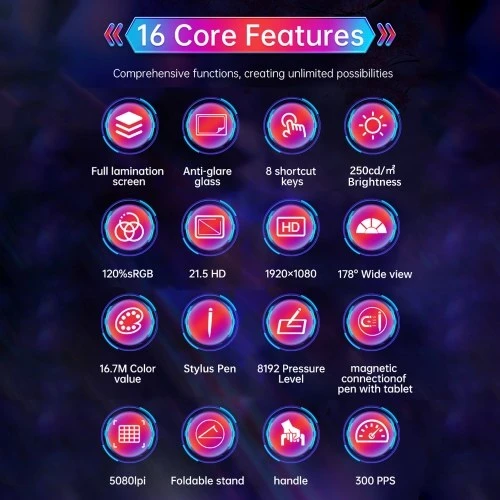 【21.5inches Remarkable LCD Screen】 X7 tablet equip with 476x268mm(18.7×10.5in) active area, and provide 1920*1080 high resolution, 16.7M abundant color depth, 1000:1 contrast ratio, 250cd/㎡ brightness and 178° viewing angle, presents every creating details in front of you.