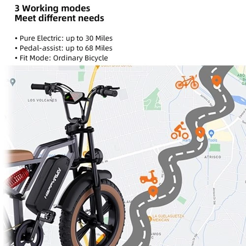 Multiple working modes: The cruising range can reach 30 miles in pure electric mode and 68 miles in pedal assist mode.