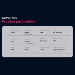 [Smart APP] The smart app (Go Navee) can offer real-time riding statistics after connecting to N65 via BT, and it supports setting cruise control, vehicle self-check, etc.Â
