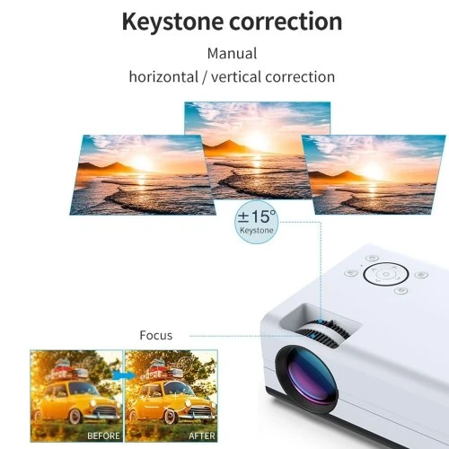 Wide Application: Home projector can manually adjust the keystone correction by 15 degrees, and can be used for a variety of purposes, ideal for home theater, video conferences, and presentations, movie nights, and gaming.