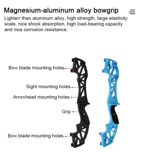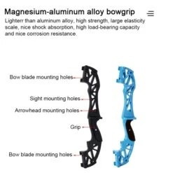 Magnesiums-aluminum alloy bowgrip, lighterr than aluminum alloy, high strength, large elasticity scale, nice shock absorption, high load-bearing capacity and nice corrosion resistance.