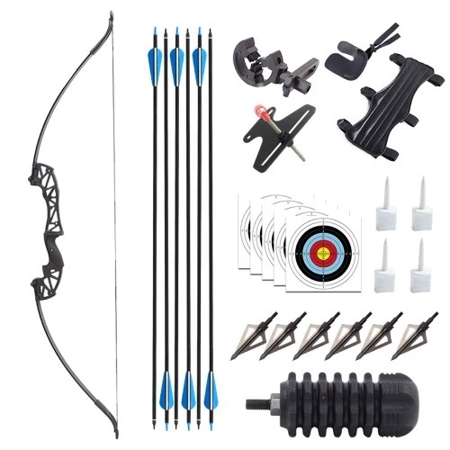 Recurve archery set includes a recurve bow, 6 mixed carbon arrows, 6 arrowhesds, a brush arrows rest, a singles-pin bow sight, an arm guard, a finger guard, 5 target papers, 4 target nails and a rubber shock absorber.