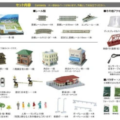 Mini layout (suburban, river, station front) x 1 each, straight track 55mm x 3pcs, end rail × 1pc, straight track 25mm x 4pcs, curved track R127-26° x 4pcs, straight track 110mm without roadbed x 1pc, tin roof farmhouse x 1pc, tin roof barnx 1pc, house C x 1pc, corner store B x 1pc, Shop A x 1pc, Commercial building C x 1pc, Passenger car x 4pc, Railroad crossing (Japanese type) x 2pc, Station building x 1pc, Fence (brown) x 3pc, (white) x 1pc, Evergreen tree x 36pcs, Doll x 5pc, Street light x 8pc, Guard rail (long and short) x 4pc each, Display cover (large) x 2pc, (small) x 1pc, Single track truss railway bridge (short) 110mm red x 1pc, logo sticker x 2pcs, extension cable for sensor cable x 1pc, forage x 2pcs, ballast x 2packs, powder x 7packs, Instruction manual x 1pc