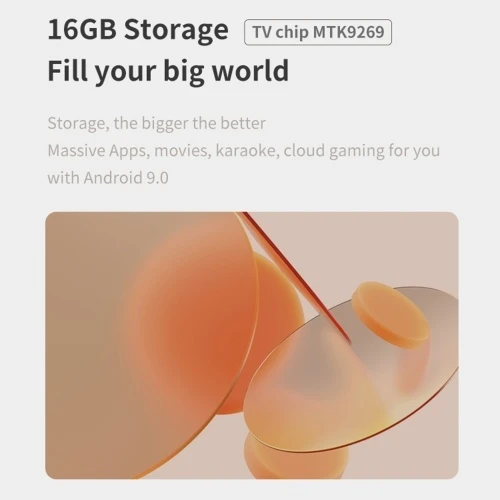 16GB Storage: TV chip MTK9269, fill your big world. Storage, the bigger the better, Massive Apps, movies, karaoke, cloud gaming for you with Android 9.0.